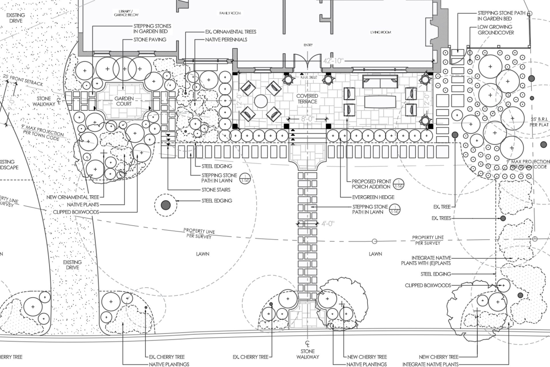 Dimensions are added to communicate scale and proportion. Materials are defined, distinguishing between surfaces such as stone, gravel, or wood. Planting plans begin to take shape, shifting from abstract zones to specific strategies.