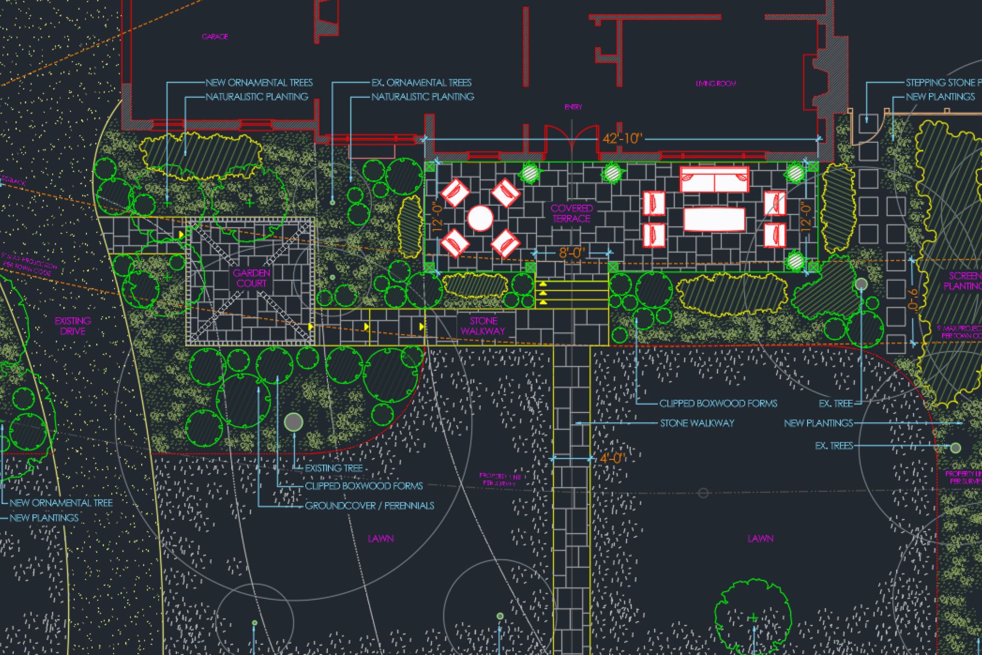 Hardscape elements such as patios, walkways, walls, and pools are laid out using real-world dimensions. Geometry is refined, alignments are corrected, and relationships between spaces are clarified.